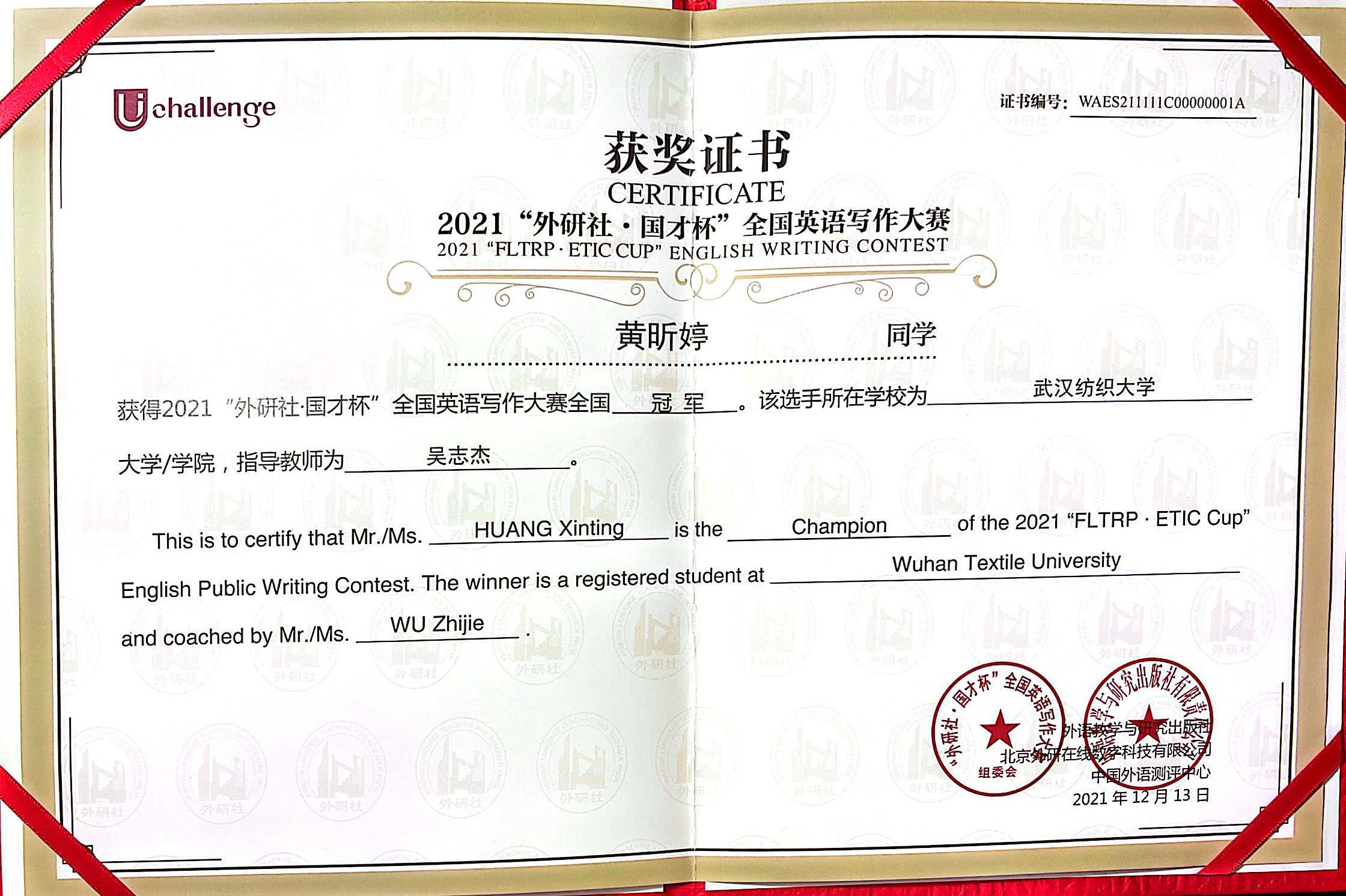 一分耕耘一分收獲。黃昕婷在外研社杯·全國大學生英語挑戰賽湖北省賽中一舉獲得特等獎。此后,在強手如林的全國賽中,她又獲得國家二等獎。